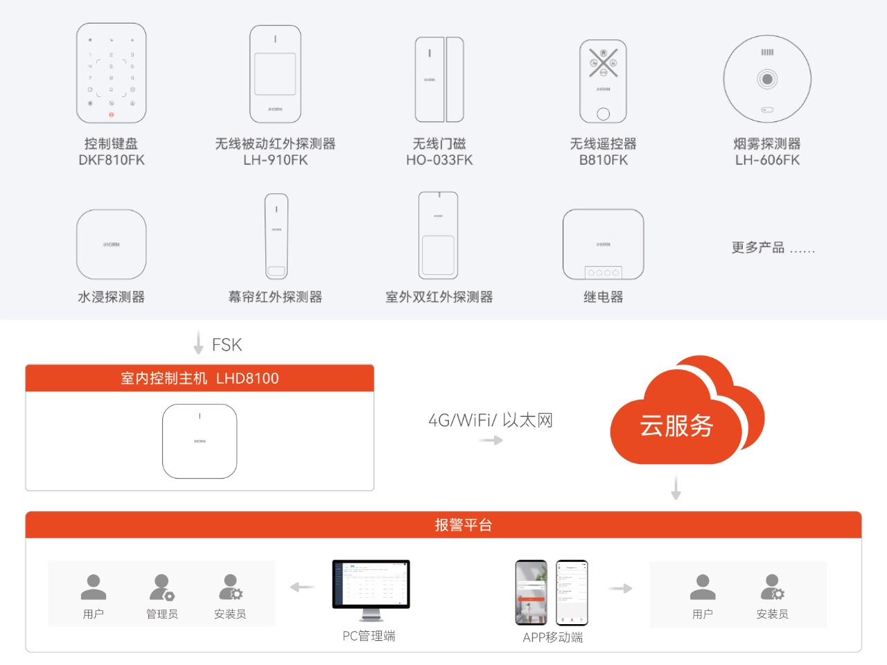 IHORN is committed to creating a "safer, more stable, and more flexible" professional alarm system, consisting of an alarm host, front-end detector, and alarm management platform. Once the front-end detector detects an abnormal situation, it immediately reports the data to the alarm host through FSK communication. The host then notifies the cloud platform through 4G/WiFi/Ethernet and other methods. The on-site sound and light alarm is triggered, and the alarm information is remotely notified to the end user through PC management, phone, SMS, APP and other methods to ensure the safety of personnel, property, and items in various places.