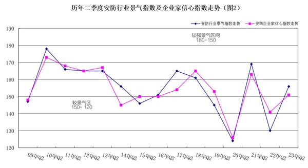 2023年二季度,我國安防行業(yè)景氣指數(shù)為156,與上季度相比上升了8點,比去年同期上升26點,位于“較強(qiáng)景氣區(qū)間”(見圖1-2)。調(diào)查企業(yè)中,有64%的企業(yè)認(rèn)為經(jīng)營狀況處于“良好”狀態(tài),與上季度相比上升9個百分點,與去年同期相比上升21個百分點;有28%的企業(yè)認(rèn)為“一般或持平”,比上季度下降10個百分點,比去年同期下降了16個百分點;有8%的企業(yè)反映經(jīng)營處于“不佳”狀況,比上季度上升了1個百分點,比去年同期下降了5個百分點。