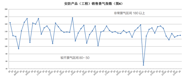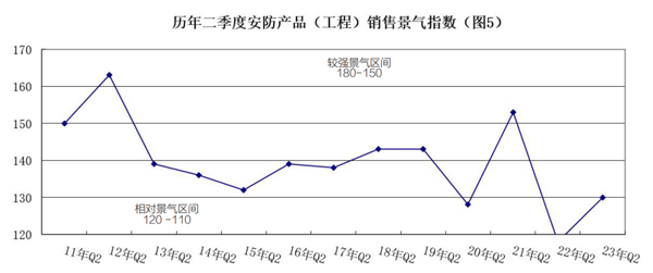 今年二季度,安防產(chǎn)品(工程)銷售景氣指數(shù)為130,比上季度上升了1點,與去年同期相比上升了12點,位于“較景氣區(qū)間”(見圖4-5)。其中,有40%的調(diào)查企業(yè)銷售額有了新的增長,比上季度下降了2個百分點;有50%的企業(yè)反映銷售“持平”,比上季度上升了5個百分點;有10%的企業(yè)反映“下降”,比上季度下降了3個百分點。