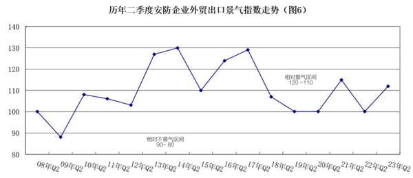 2023年二季度,外貿(mào)出口景氣指數(shù)為112,比上季度上升了7點,與去年同期相比上升了12點,位于“相對景氣區(qū)間”(見圖6)。其中,有37%的調(diào)查企業(yè)國外訂單有了新的增長,比上季度上升了10個百分點;有38%的企業(yè)反映銷售“持平”,比上季度下降了14個百分點;有25%的企業(yè)反映“下降”,比上季度上升了4個百分點。