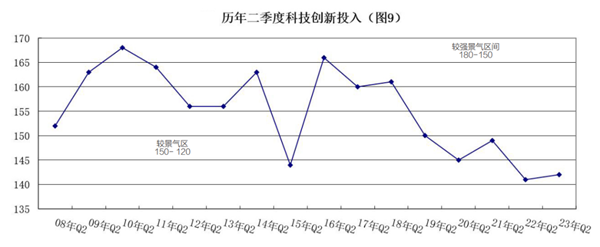 2023年二季度,安防企業(yè)科技投入景氣指數(shù)為142,比上季度上升了1點,比去年同期上升了1點,位于“較景氣區(qū)間”(見圖9)。其中,有48%的企業(yè)繼續(xù)增加了科技研發(fā)資金的投入,有47%的企業(yè)科研投入與上季度持平,有5%的企業(yè)投入下降。