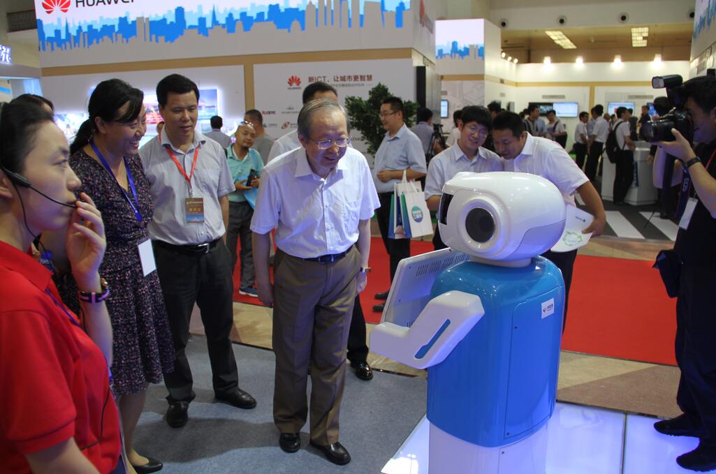 中安消技術(shù)商務(wù)中心總經(jīng)理王曉娣女士(左二)陪同原發(fā)改委副主任彭森先生(左四)參觀中安消展臺