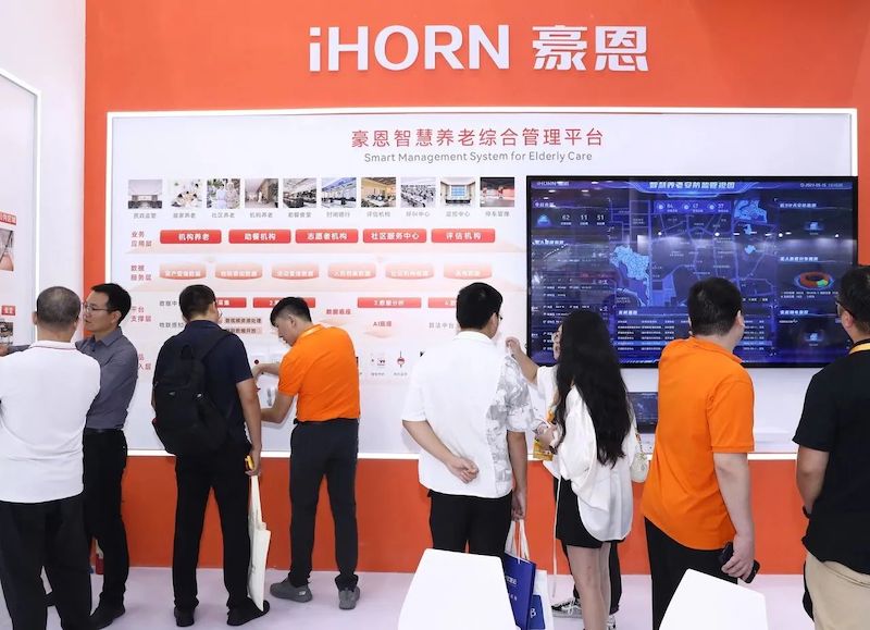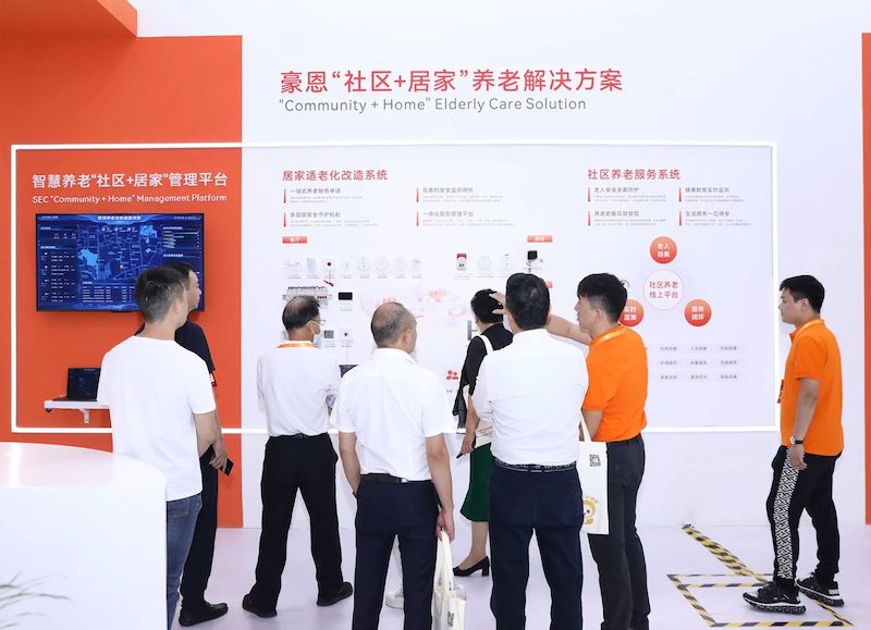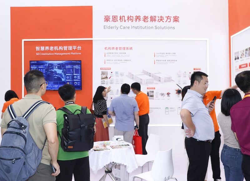 在4號館4D60展位上,豪恩橙色展臺獨樹一幟,現(xiàn)場展示了智慧養(yǎng)老綜合管理平臺、社區(qū)+居家養(yǎng)老解決方案以及機(jī)構(gòu)養(yǎng)老解決方案三大展區(qū),吸引了行業(yè)內(nèi)眾多企業(yè)與專家參觀。