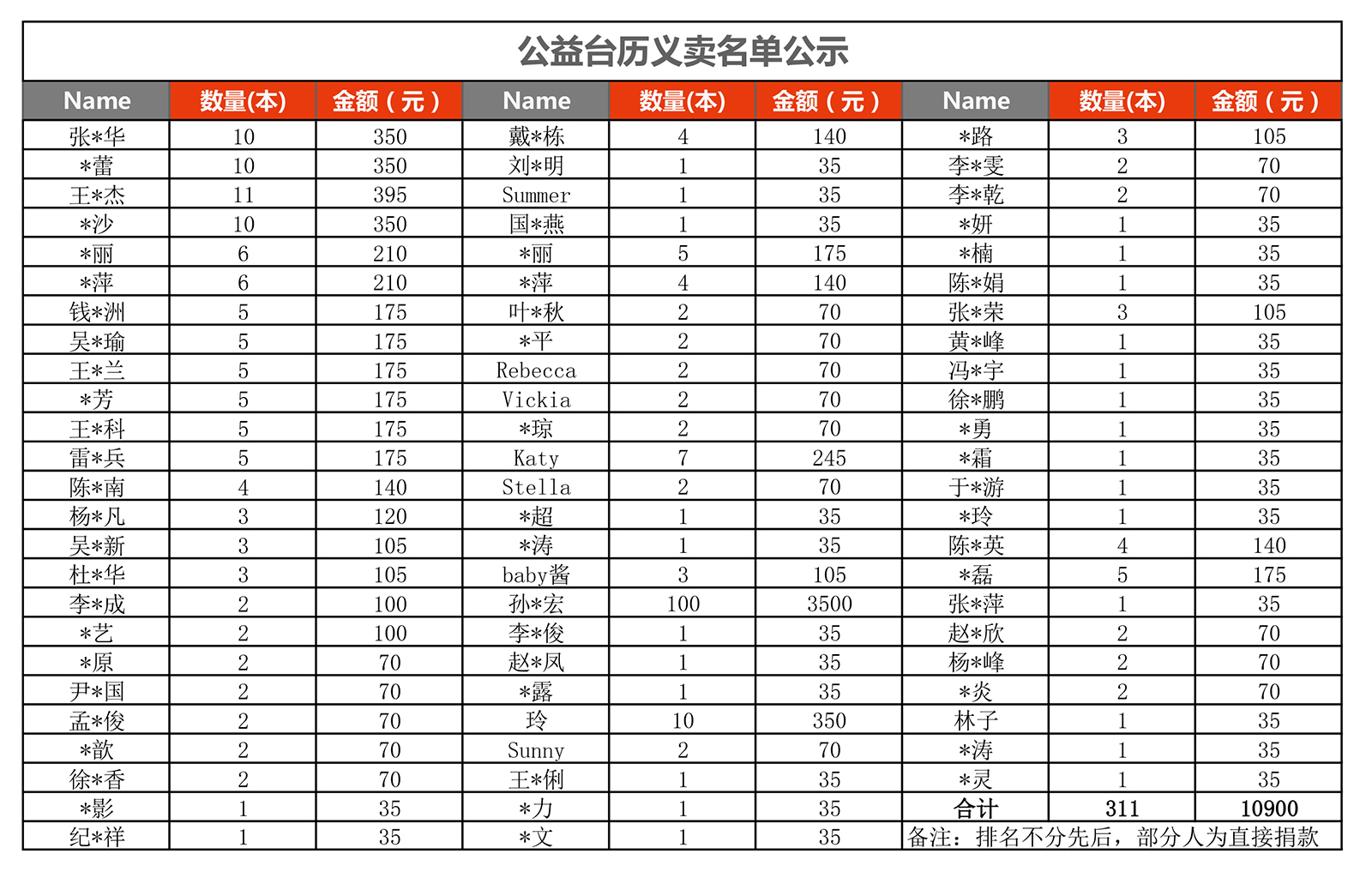 在此,我們衷心感謝感謝所有參與者,您的愛心讓“星星兒童”銘記于心。據(jù)統(tǒng)計(jì),線上線下共有73名愛心人士購買臺歷,認(rèn)購數(shù)量311本,捐款金額10900元,下表是公示記錄: