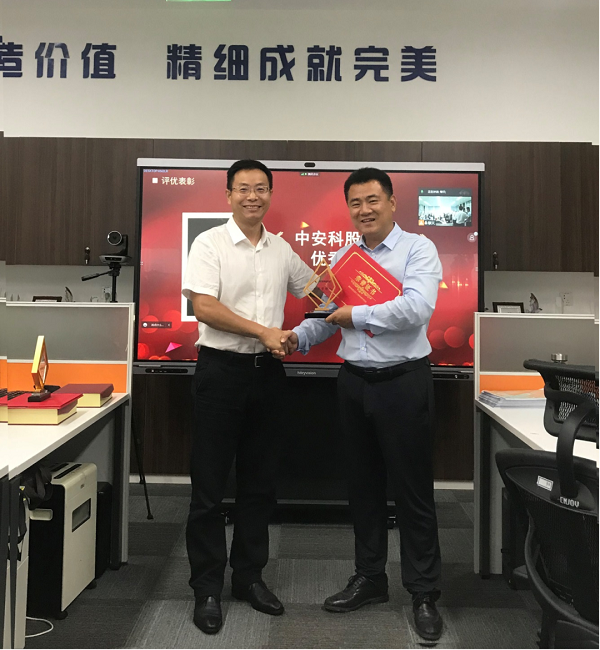 表彰大會(huì)上,由中安科股份公司副總裁兼江蘇中科智能總經(jīng)理查磊先生為項(xiàng)目組成員、劉松峰、王永亮、朱浩頒發(fā)了獎(jiǎng)杯、榮譽(yù)證書(shū)及感謝信。