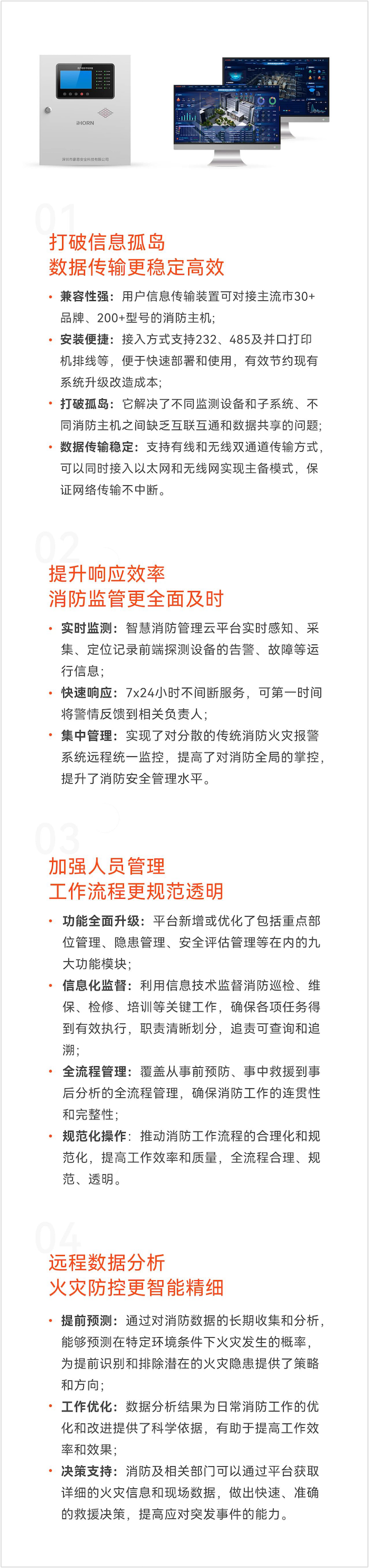 針對(duì)傳統(tǒng)消防中存在的設(shè)備狀態(tài)難監(jiān)測(cè)、警情響應(yīng)效率低、維護(hù)難監(jiān)管、數(shù)據(jù)難追溯等諸多弊端,用戶信息傳輸裝置作為關(guān)鍵的數(shù)據(jù)傳輸設(shè)備,可以實(shí)現(xiàn)對(duì)傳統(tǒng)消防主機(jī)的信息收集和數(shù)據(jù)上傳,對(duì)分散的消防用水、用氣、用電等子系統(tǒng)進(jìn)行集中管理和實(shí)時(shí)監(jiān)測(cè),在提高消防安全管理水平、預(yù)防和減少火災(zāi)事故的發(fā)生方面發(fā)揮著重要作用。本次品牌盛會(huì),可兼容主流市場(chǎng)30+品牌、200+型號(hào)消防主機(jī),支持有線和無(wú)線雙通道傳輸方式,安裝便捷支持232、485及并口打印機(jī)排線的豪恩用戶信息傳輸裝置引發(fā)關(guān)注。作為傳統(tǒng)消防智慧升級(jí)解決方案的旗艦產(chǎn)品,豪恩用戶信息傳輸裝置與智慧消防綜合管理平臺(tái)強(qiáng)強(qiáng)聯(lián)合,打通數(shù)據(jù)壁壘,遠(yuǎn)程共享信息,化被動(dòng)知曉為主動(dòng)監(jiān)測(cè),有效提升了感知預(yù)警能力與應(yīng)急指揮能力。
